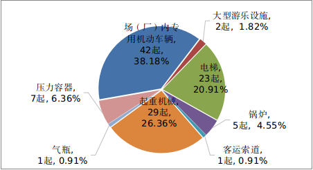 按設備類别劃(huà)分,鍋爐事故(gu)5起,死亡6人;壓力容器事故(gù)7起,死亡11人;氣瓶事故1起,死亡1人;場(廠)内專(zhuan)用機動車輛事故(gù)42起,死亡34人;起重機械事故(gu)29起,死亡30人;電梯事故23起,死亡17人;大(da)型遊樂設施事故(gu)2起;客運索道(dào)事故1起。(見圖3、圖4)其中,場(廠)内(nèi)專用機動車輛、起(qi)重機械和電梯事(shì)故占比較大,占事(shi)故總起數的85.5%、死亡總人數(shu)的81.8%。