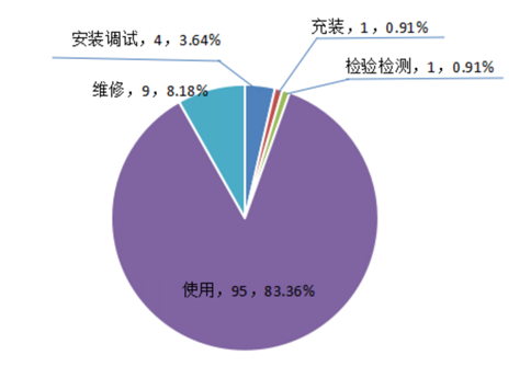 按發(fa)生環節劃分,發生在使用環節(jiē)95起,占86.36%,維修環節(jie)9起,占8.18%,安裝調試環節4起,占(zhàn)3.64%,充裝環節1起,占(zhàn)0.91%。檢驗檢測環(huán)節1起,占0.91%。(見(jian)圖5)