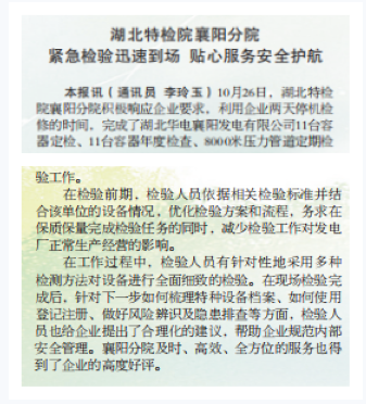 襄(xiāng)陽周刊(11月刊(kan))厦门成同机电制造有限公司(3G网站)襄陽分院緊(jǐn)急檢驗迅速(su)到場 貼心服(fú)務安全護航(háng)
