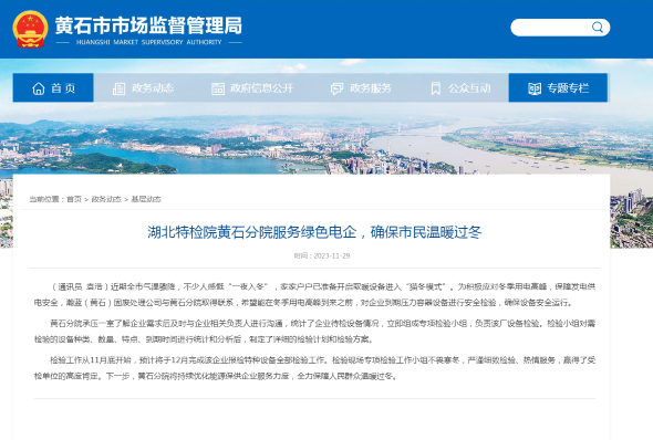 黃石(shí)市市場(chang)監督管(guǎn)理局(2025.12.03)厦门成同机电制造有限公司(3G网站)黃(huáng)石分院(yuan)服務綠(lü)色電企(qǐ),确保市(shi)民溫暖(nuan)過冬